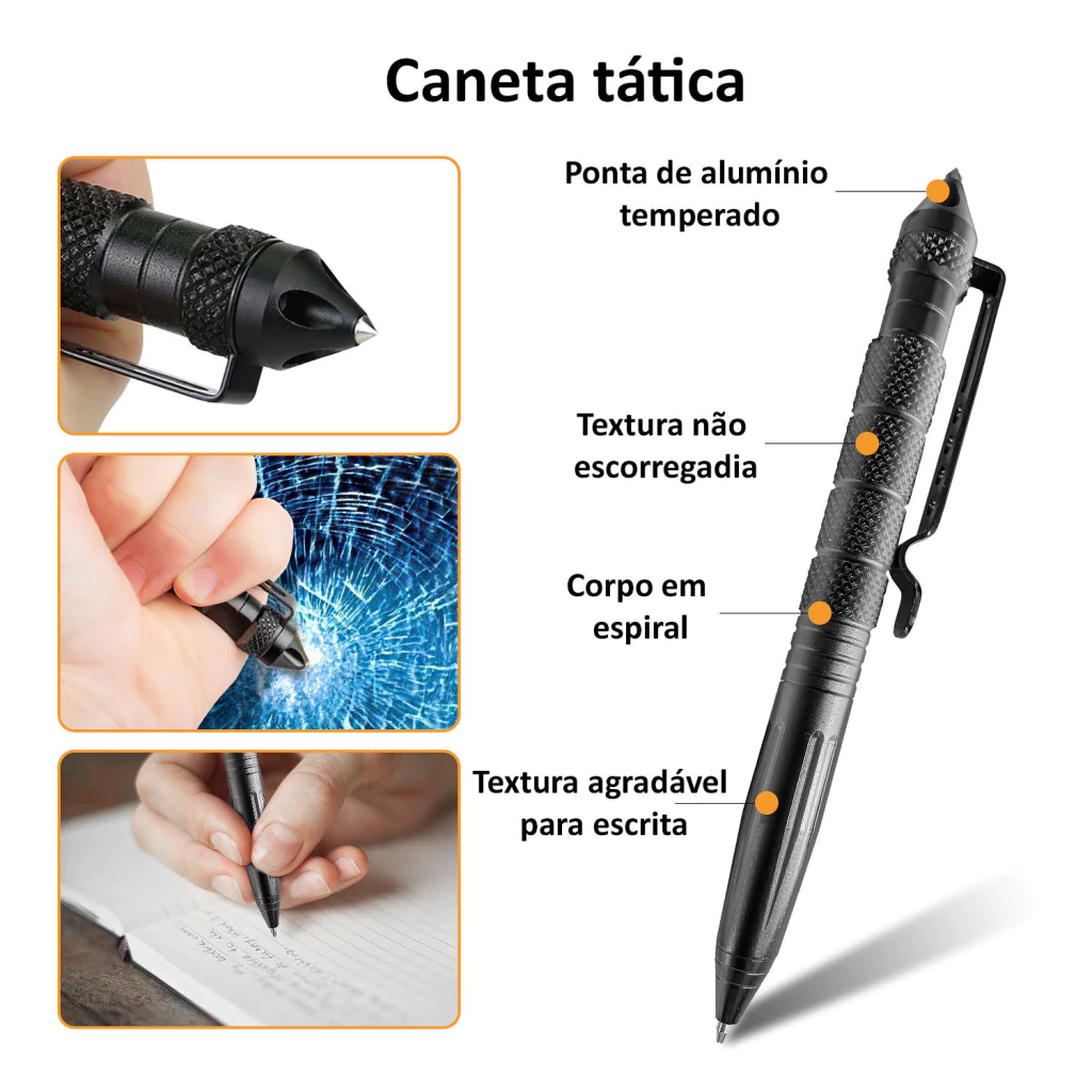 - Caneta tática, com função de escrita e outra ponta rígida, podendo quebrar vidro ou ser usado para defesa ou ataque.